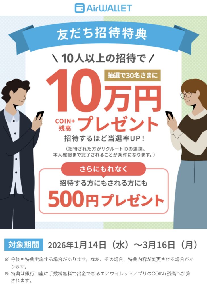 2026年2月開催中のエアウォレットの友達招待キャンペーンについて、概要は以下の通りです。