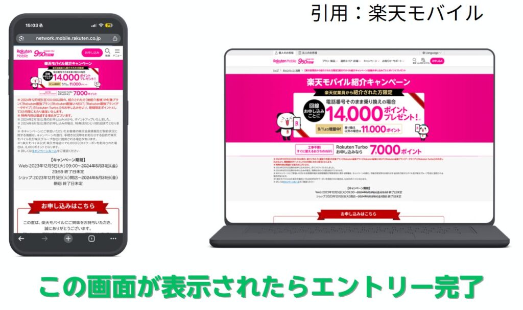 2025年12月現在、楽天モバイルでは、楽天従業員の紹介リンクを経由して楽天モバイルを申し込みした人に1回線につき最大14,000ポイントを進呈するキャンペーンを実施しています。