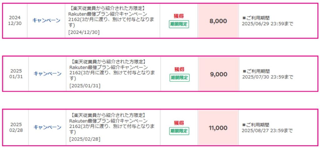 ポイント明細に「【楽天従業員から紹介された方限定】Rakuten最強プラン紹介キャンペーン2162(3カ月に渡り、別けて付与となります)」があれば、付与されています。