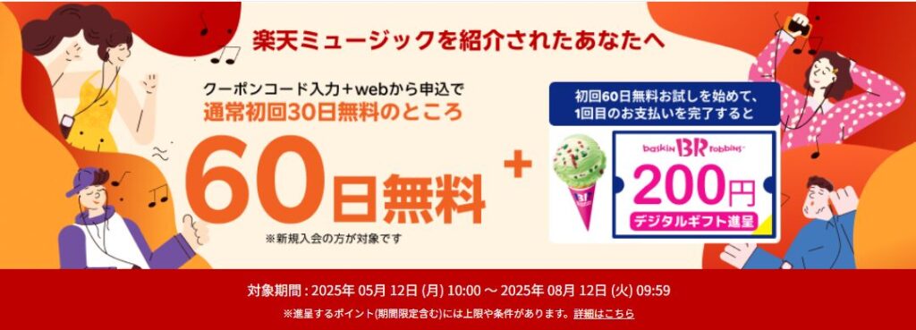当サイトのリンク経由で楽天ミュージックを利用すると、60日間無料でサービスを利用できるのでお得です。もしサービスが気に入って、有料プランの課金も行うと、200円分のサーティワンデジタルギフト券も進呈しています。