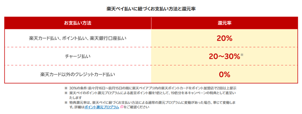 - 20倍の内訳は楽天ペイの通常還元ポイント1倍とキャンペーン特典で19倍分