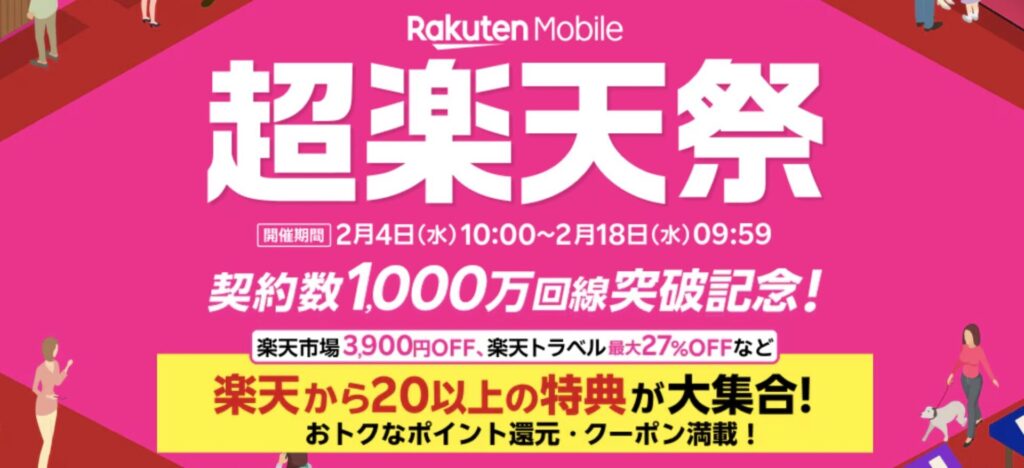 「超楽天祭」とは、楽天モバイルの契約数1,000万回線突破を記念して、楽天モバイルユーザーを対象にお得なクーポンやポイントをプレゼントするお得の祭典です。
