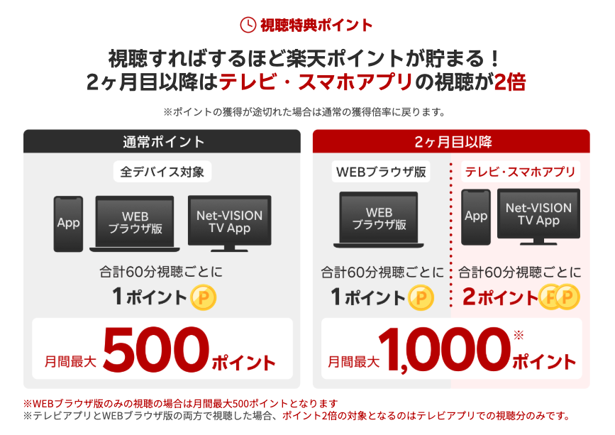 - 視聴時間に応じて月間最大1,000ポイント還元 ※60分視聴で1ポイント