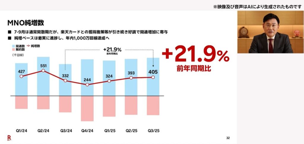 AI三木谷社長は、第3四半期のMNO純増数は約405,000回線と発表しました。