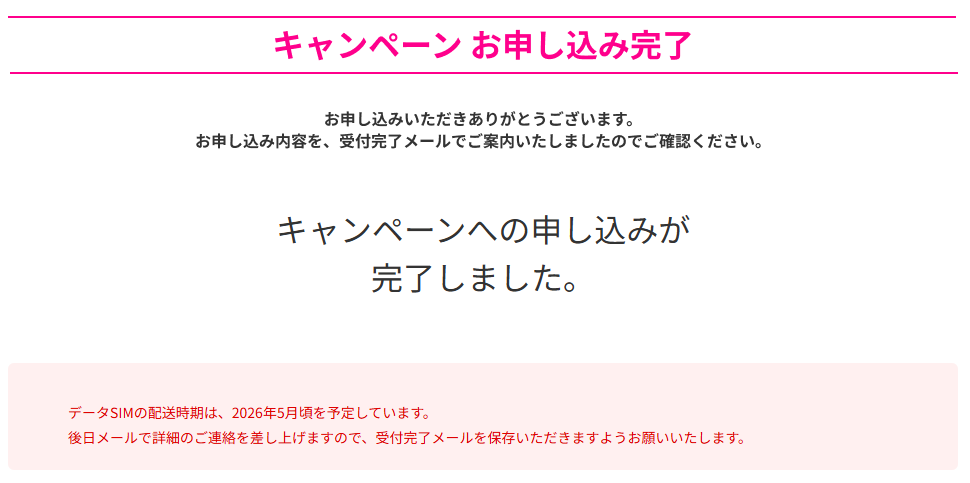 条件達成後、2026年5月頃を目途にSIMが配送される予定です。