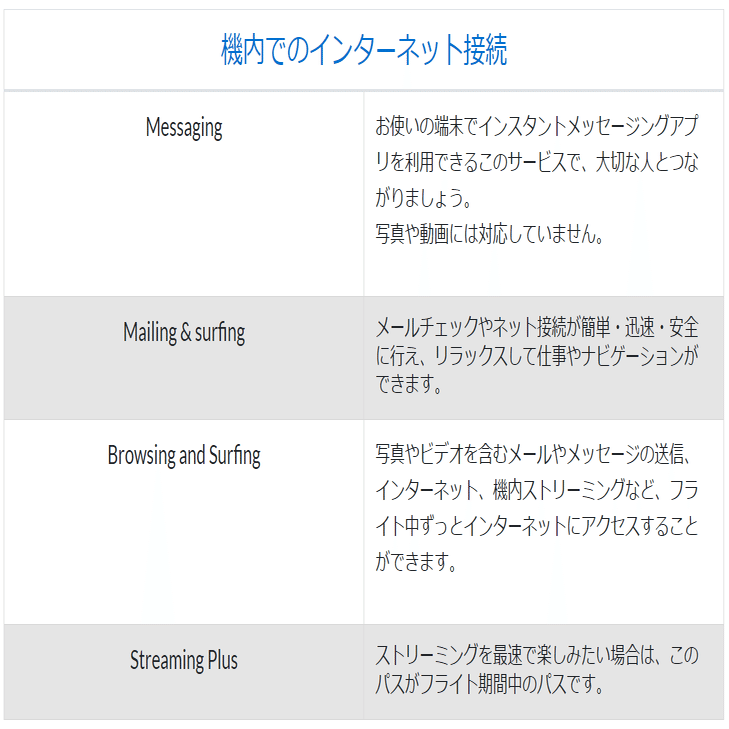 有料のものは最大33USDで、最大600kbpsの通信速度で750MBまで機内インターネットを利用可能です。