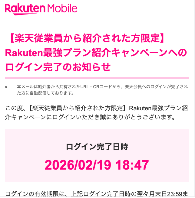 【楽天従業員から紹介された方限定】 Rakuten最強プラン紹介キャンペーンへのログイン完了のお知らせ