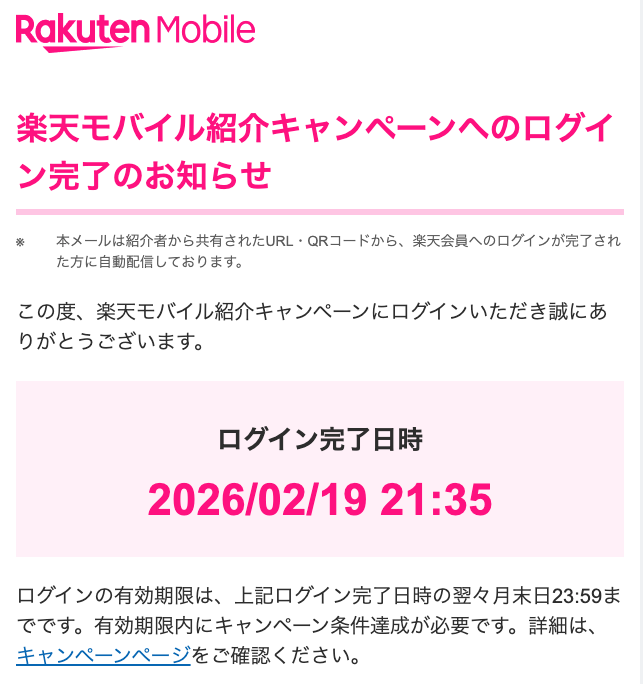メール件名:楽天モバイル紹介キャンペーンへのログイン完了のお知らせ