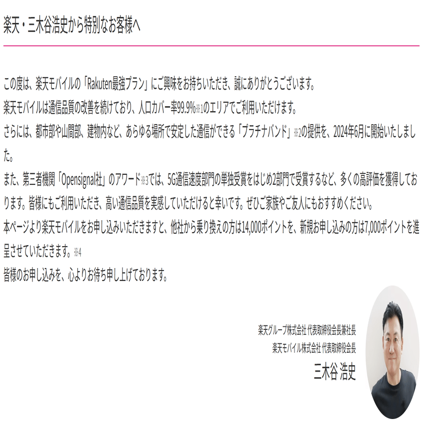 楽天モバイルの三木谷キャンペーンとは、簡単に言えば、楽天グループの三木谷社長が提供する楽天モバイルの紹介キャンペーンです。