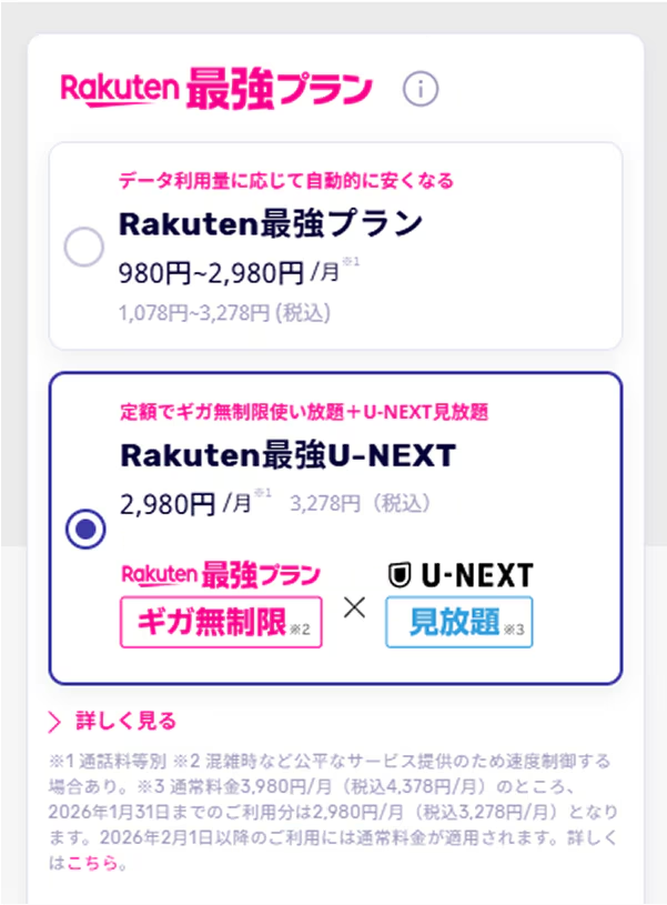 • Rakuten最強U-NEXT、Rakuten最強プラン(データタイプ)、Rakuten Turboも対象に含まれる