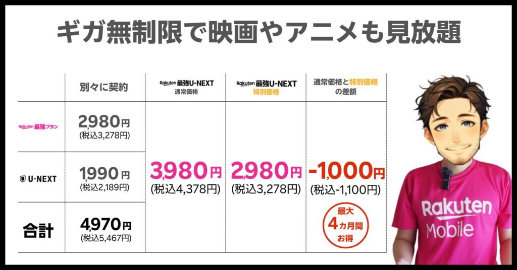 Rakuten最強U-NEXTは通常価格3,980円(税抜)/月で提供し、Rakuten最強プランとU-NEXTを別々に契約すると合計4,970円(税抜)/月となるので、別々に契約するよりも990円(税抜)お得です。