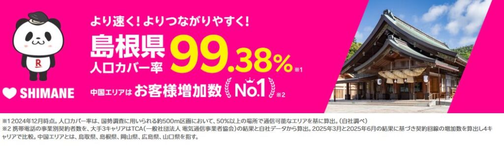 楽天モバイルの電波は、島根県の人口カバー率99.38%を達成しています。(2024年12月時点)